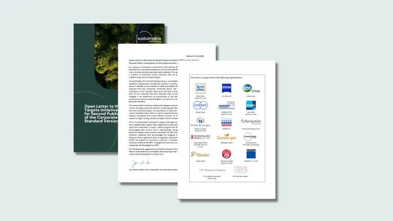 Unser Ziel bei Sustainable ist es, mit unserer Arbeit jeden Tag zu einer nachhaltigen Entwicklung beizutragen. Daher begrüßen wir die Weiterentwicklung des Net-Zero Standards ausdrücklich. Er stellt einen entscheidenden Hebel dar, um die weltweite Dekarbonisierung voranzutreiben. Mit diesem offenen Brief einer branchenübergreifenden Unternehmenskoalition teilen wir unsere Perspektive zum zweiten Entwurf des Net-Zero Standards V2.0 und möchten dazu beitragen, dass der neue Standard noch klarer und anwendbarer wird.